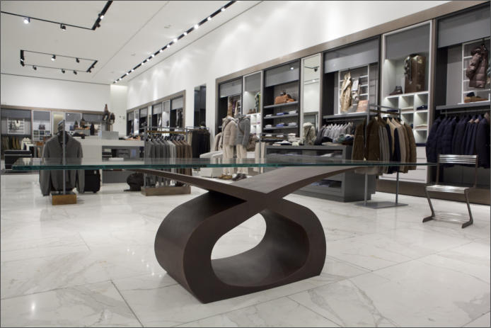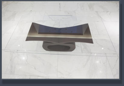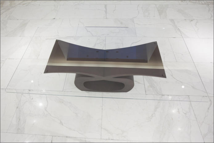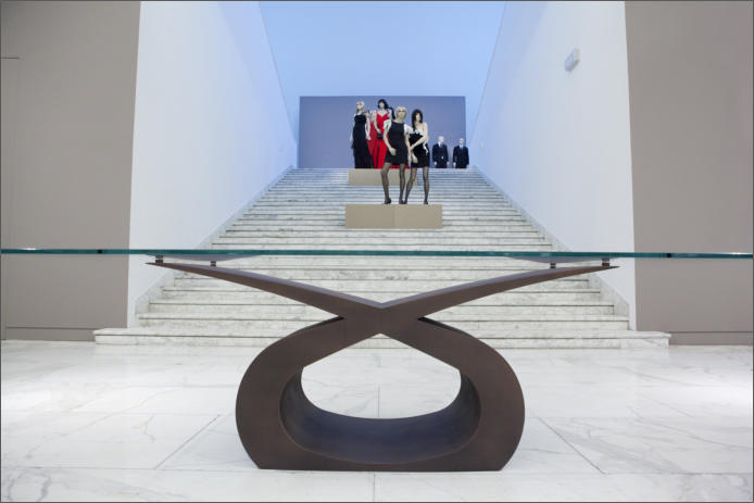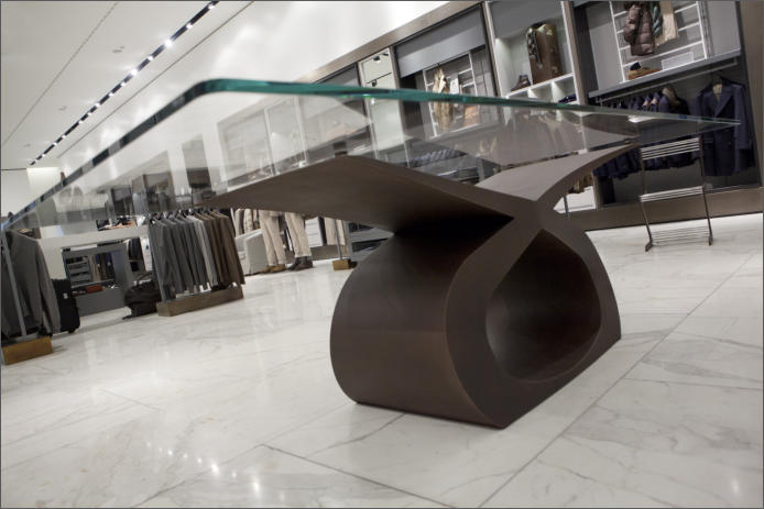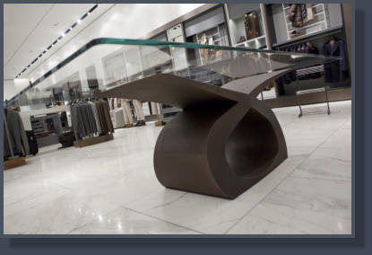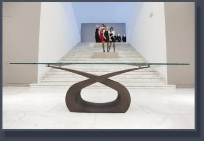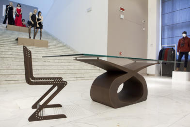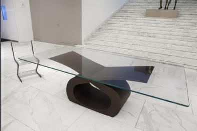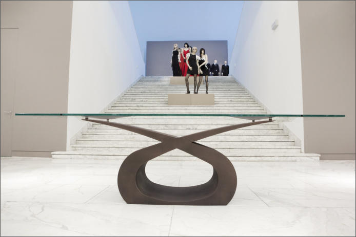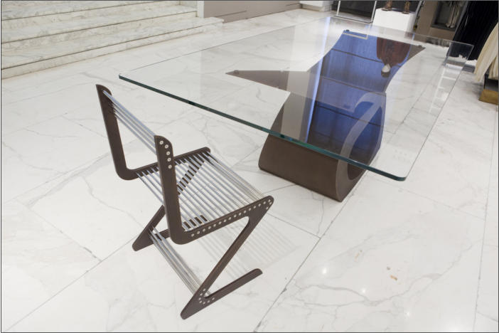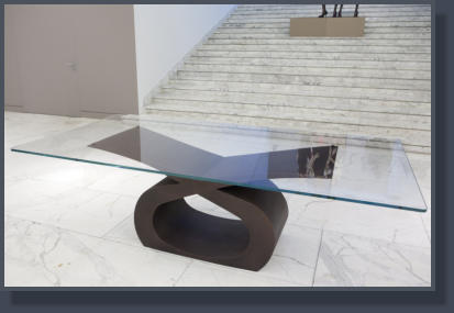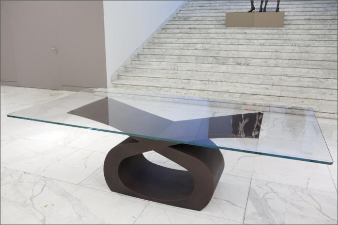 Tavolo in ferro bronzato e piano in cristallo